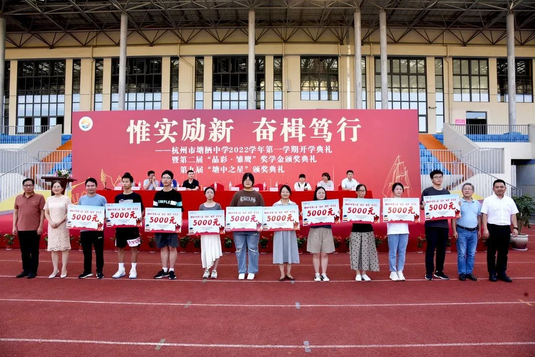 9月6日下午,意昂体育社区慈善基金会理事长孙伟荣、理事许素萍受邀参加了塘栖中学举办的2022学年第一学期开学典礼暨第二届“晶彩·雏鹰”奖学金颁奖典礼。