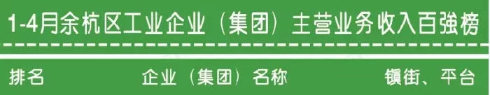 经余杭区经济和信息化局官方微信权威发布,1-4月,全区实现规模工业增加值127.23亿元,增长12.7%,增幅高于上年同期9.7个百分点,增幅创2011年以来新高;其中,主营业务收入前百家企业(集团)完成主营业务收入295.82亿元,同比增长29.0%,比全区平均高出7.2个百分点,占全区比重达55.9%,比上年同期提高3.7个百分点。我公司有幸列入了1-4月余杭区工业企业(集团)主营业务收入百强榜。