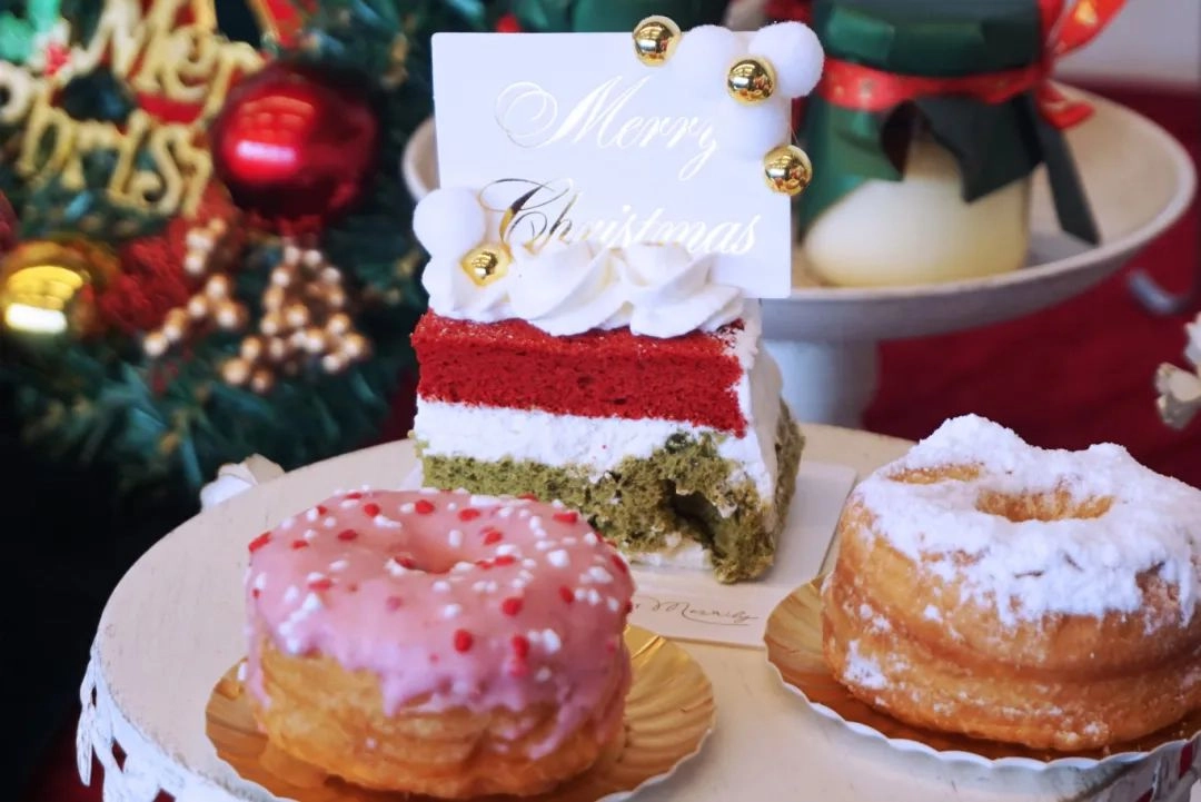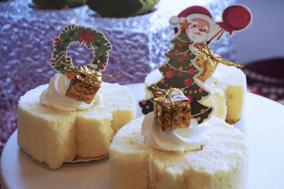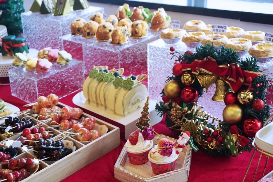 瞧!桌上摆满了琳琅满目的美食~香甜的纸杯蛋糕、软糯的蛋糕切块、蓬松的泡芙甜点...浓郁且甜蜜的香味在空气中交融,每一款点心都充满了节日的氛围!